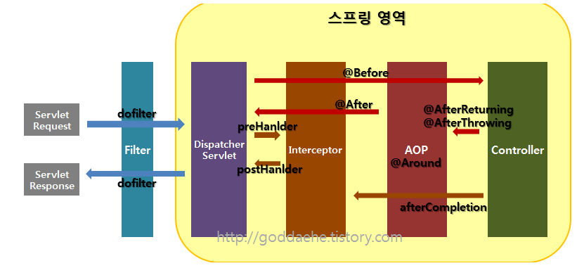 - Interceptor와 Filter는 Servlet 단위에서 실행된다. 반면 AOP는 메소드 앞에 Proxy패턴의 형태로 실행된다.