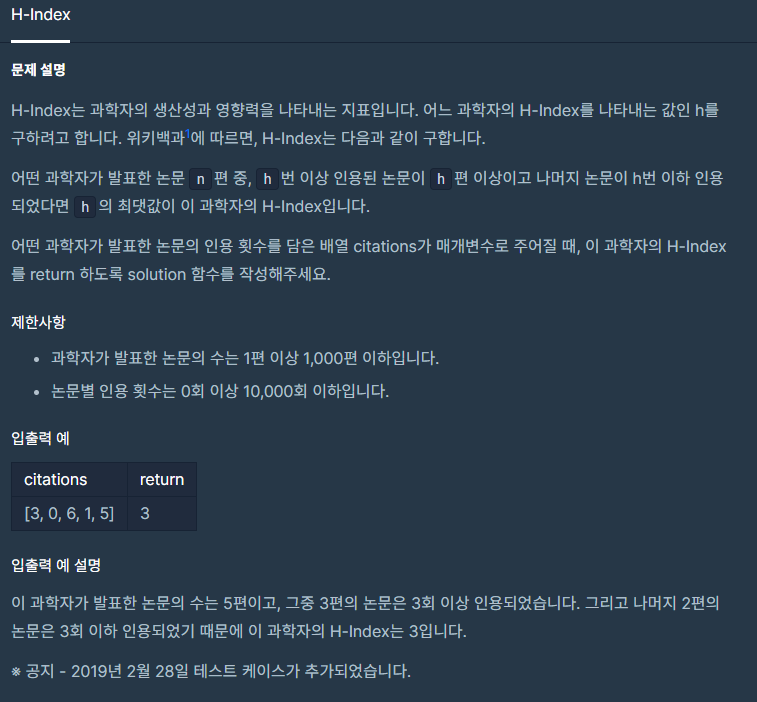 코딩테스트 연습 - H-Index