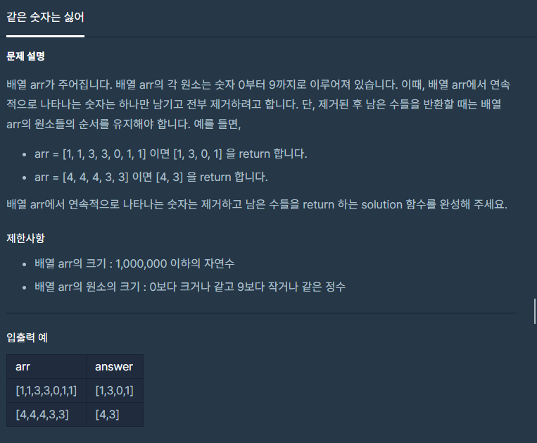배열 arr가 주어집니다. 배열 arr의 각 원소는 숫자 0부터 9까지로 이루어져 있습니다. 이때, 배열 arr에서 연속적으로 나타나는 숫자는 하나만 남기고 전부 제거하려고 합니다. 단, 제거된 후 남은