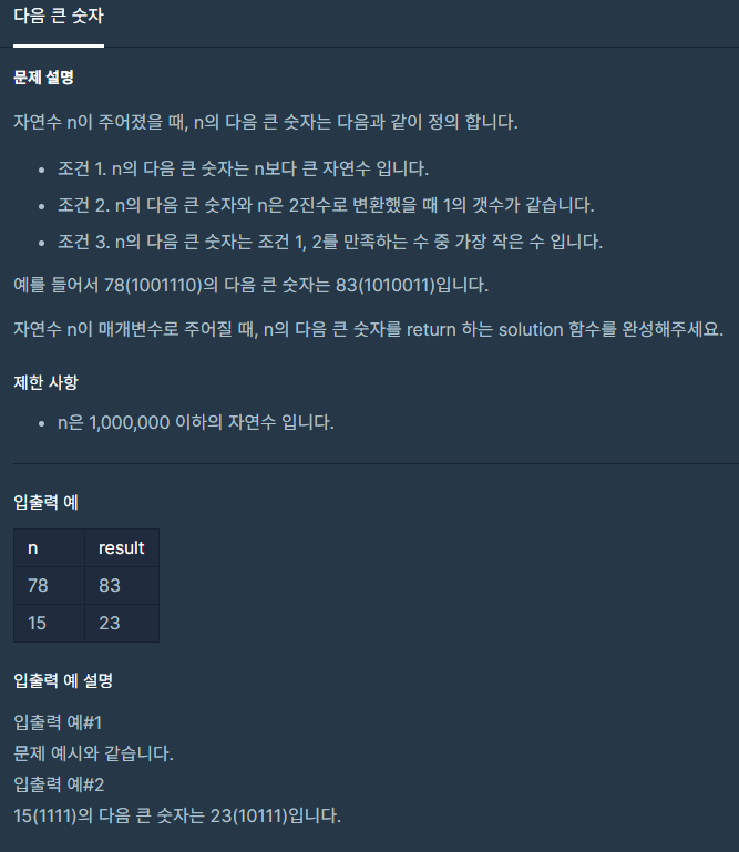 자연수 n이 주어졌을 때, n의 다음 큰 숫자는 다음과 같이 정의 합니다. 조건 1. n의 다음 큰 숫자는 n보다 큰 자연수 입니다. 조건 2. n의 다음 큰 숫자와 n은 2진수로 변환했을 때 1의 갯수가 같습니