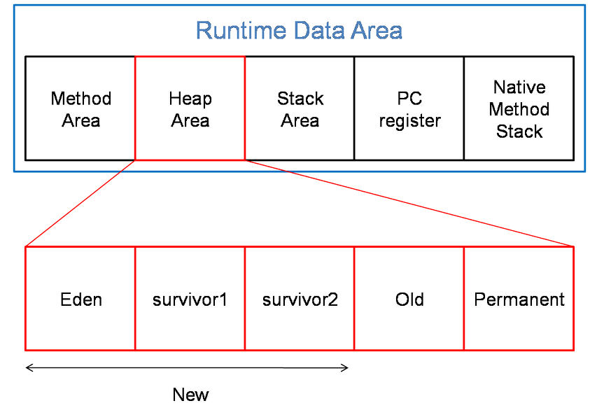 이 역역은 크게 Method Area, Heap Area, Stack Area, PC Register, Native Method Stack로 나눌수 있다.
