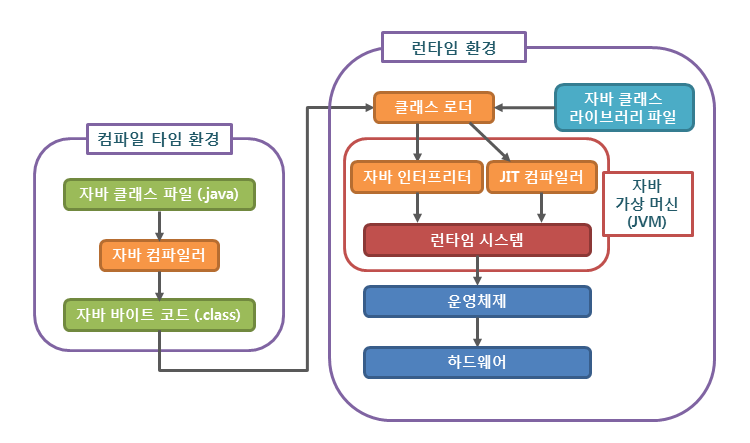 JVM(Java Virtual Machine) : 자바 가상 머신으로 자바 바이트 코드를 실행할 수 있는 주체다. CPU나 운영체제(플랫폼)의 종류와 무관하게 실행이 가능하다. 즉, 운영체제 위에서 동작하는 프로세스로 자